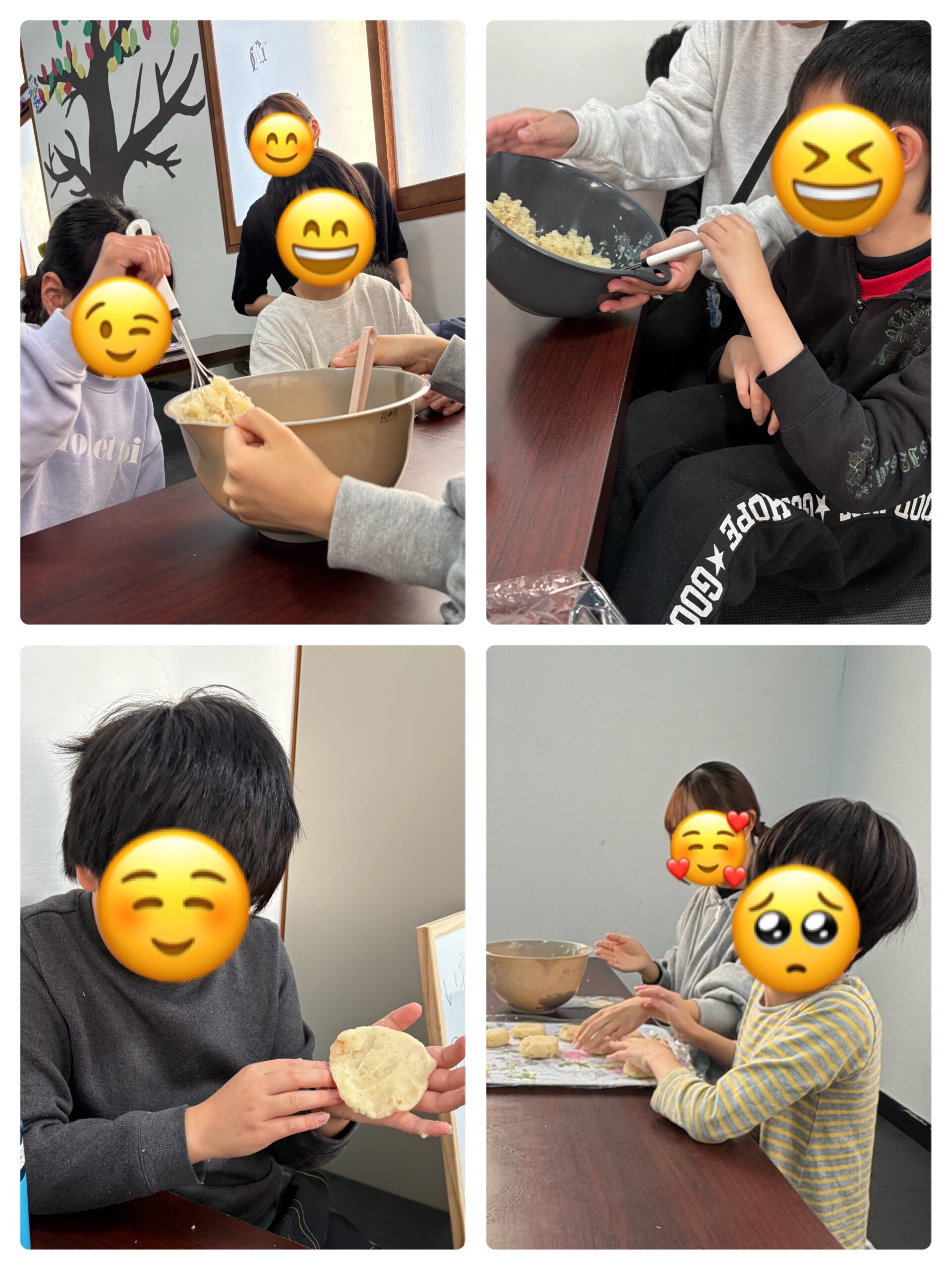 じゃがいもを調理器具でつぶしてから、形を作る子どもたち💪🏻